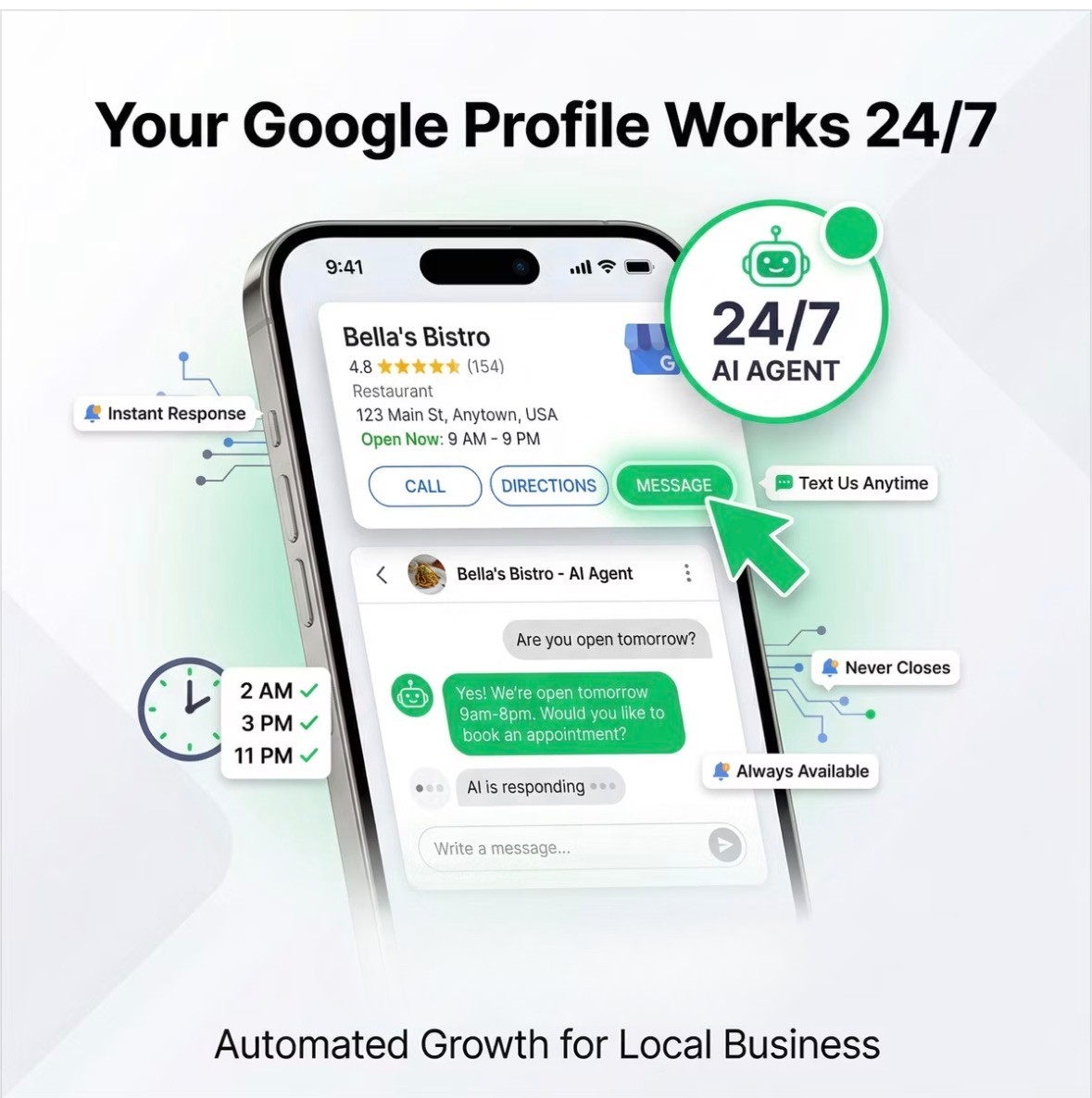 Today’s customers expect instant answers. It works around the clock 24/7 on your website, capturing leads, answering questions, booking appointments, and guiding visitors toward taking action — even when your team is offline.